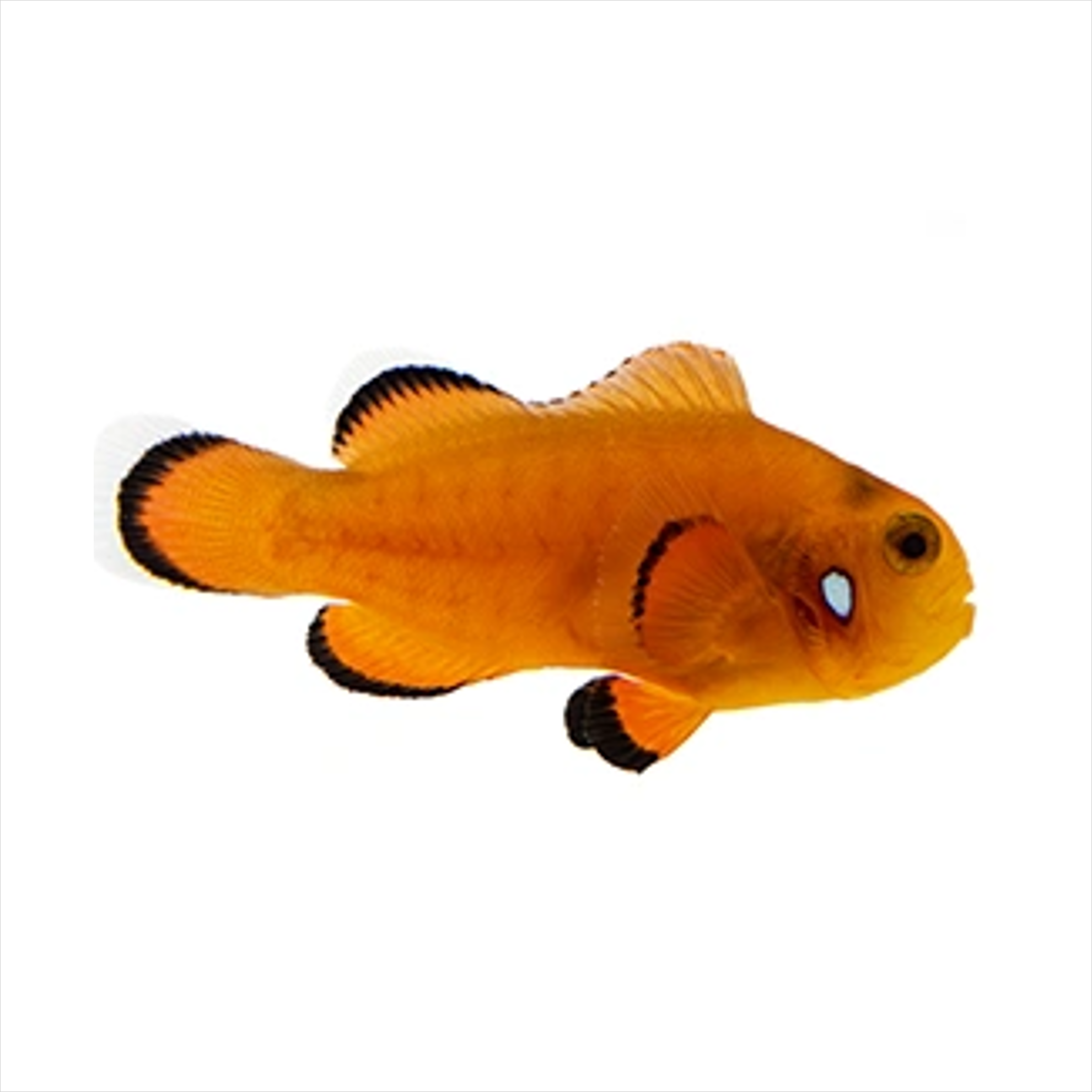 Orange Dominoes are Orange Ocellaris the have been selectively bred to exhibit minimal barring/stripes. A Domino has at least one white dot, usually located on the head on one or both sides, on an otherwise all Orange Ocellaris. These dots are simply the remnant barring. An orange domino is a rare form of an Extreme Misbar Ocellaris.